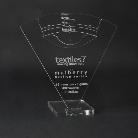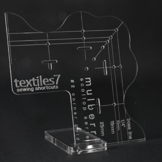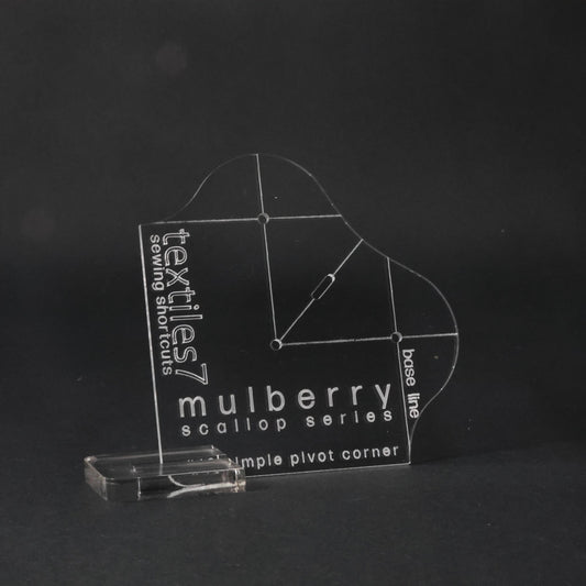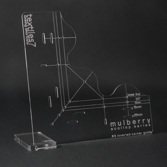 The Mulberry silhouette is a single gentle shallow scallop giving the effect of movement and flow. This scallop is ideal for beginners as the machine needle does not have to be ‘taken up’ to pivot or turn. The Mulberry requires a stitch length of 2.5 and is extremely forgiving of any sewing missteps. The inverted corner and corner scallop shapes are large enabling beginners to negotiate these curves without fussy tight turning.